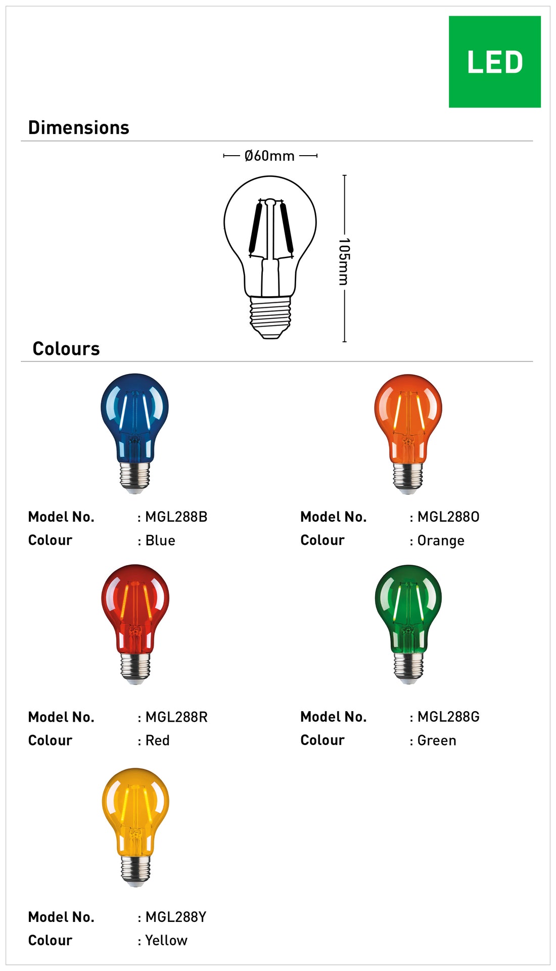 Decorative filament LED bulbs combine energy-efficient lighting with a stylish, vintage design, offering long-lasting performance and a warm, ambient glow perfect for enhancing any space. This globe is available in red, blue,green,yellow and orange.